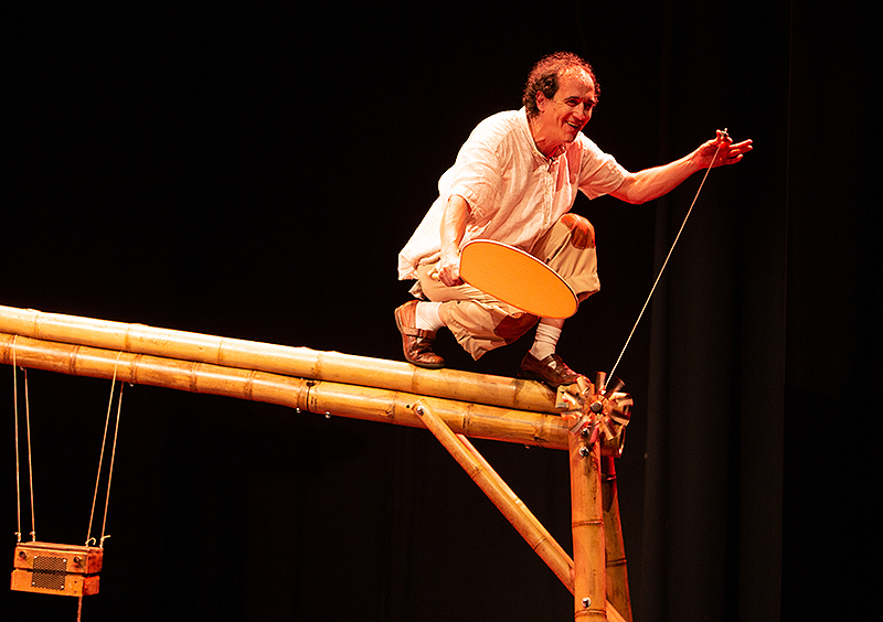 Desde un enfoque circense, visual y emocional, hemos imaginado dos planos de acción que coexisten; uno mas poético y plástico que muestra el discurso mas humanista y el carácter de autosuficiencia del personaje; y otro mas dinámico basado en las técnicas circenses y en la relación con el publico.